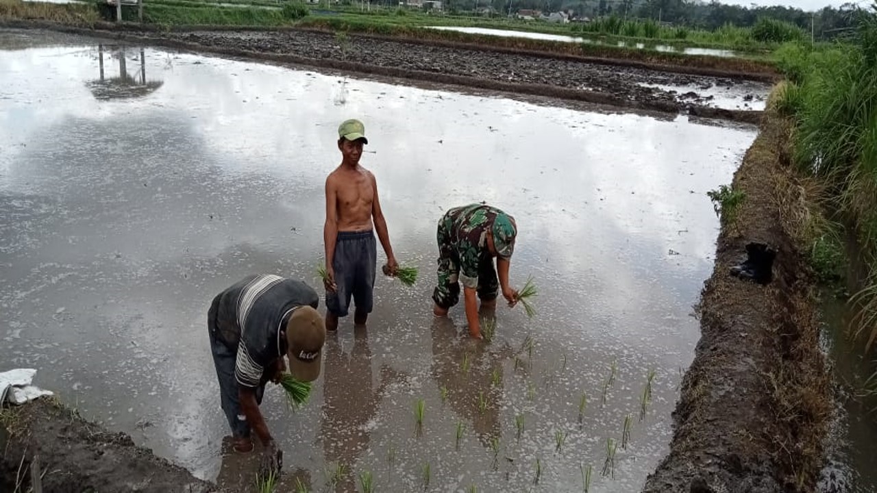Dukung Ketahanan Pangan, Babinsa Koramil Sanankulon Bantu Menanam Padi Di Sawah Warga Binaannya